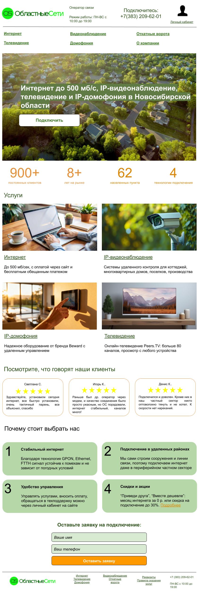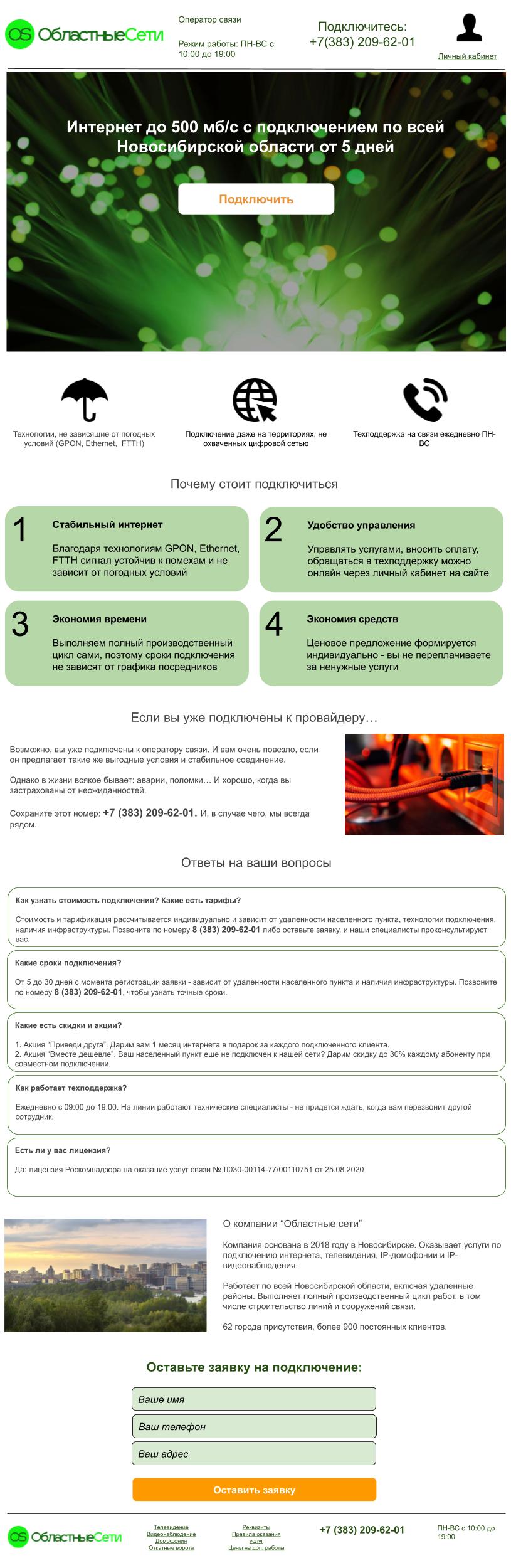 Результат: в макете главной страницы построена понятная навигация по сайту и сделан акцент на преимуществах компании. Макеты посадочных выполнены по маркетинговой модели AIDA, чтобы увеличить конверсию в заявку на подключение. Цветовая гамма выбрана так, чтобы отстроиться от конкурентов компании.